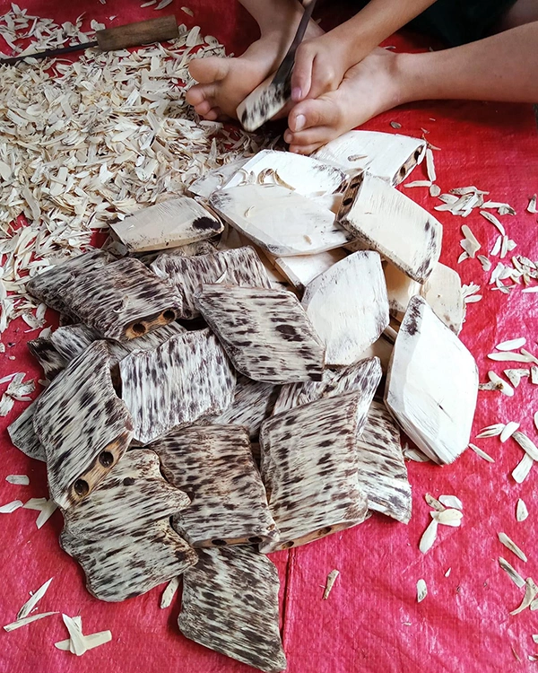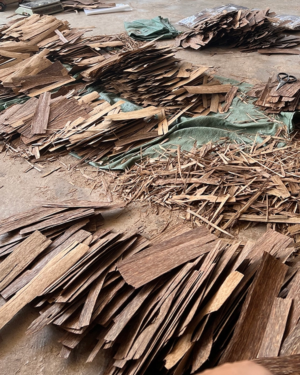 Các miếng trầm cấy tạo chưa rục hầu đang được thợ xỉa bỏ giác trầm.